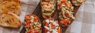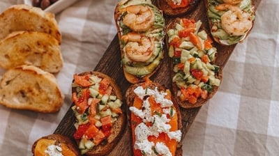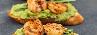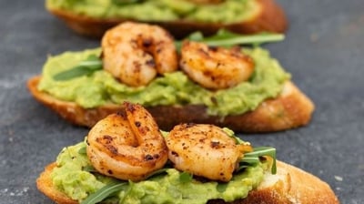 Brusketa ar stampātu avokādo, viegli pikantu tomātu salsu un grillētām tīģergarnelēm. 8gb